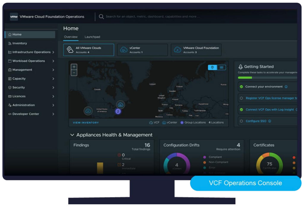 VCF 9 introduceerd VCF Operations. De VCF Operations Console in VCF 9 is de meest ingrijpende vernieuwing in deze release. Het is niet meer alleen een monitoringtool zoals Aria operations dat was. VCF Operations is het centrale beheer platform waarin je functionaliteit terugvindt die je voorheen in vCenter, Aria Operations, Aria Lifecycle manager en bijvoorbeeld Aria Operations for networks terug vondt.