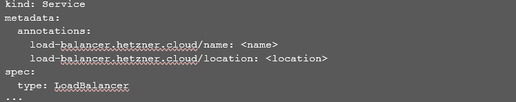 I alle fire clouds bruges der simple annotationer for integration og konfiguration af load balancer. Nedenfor ses et eksempeluddrag af en Hetzner manifest file. De øvrige clouds er tilsvarende, dog med andre annotationer: