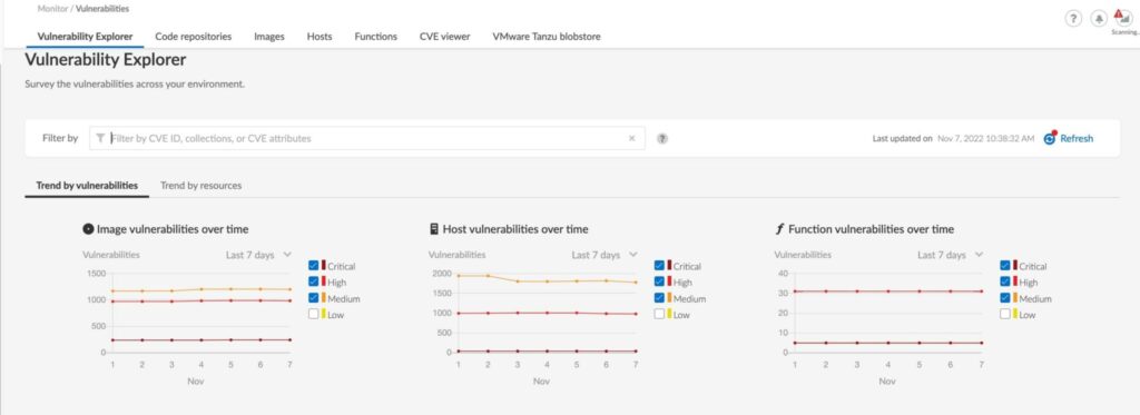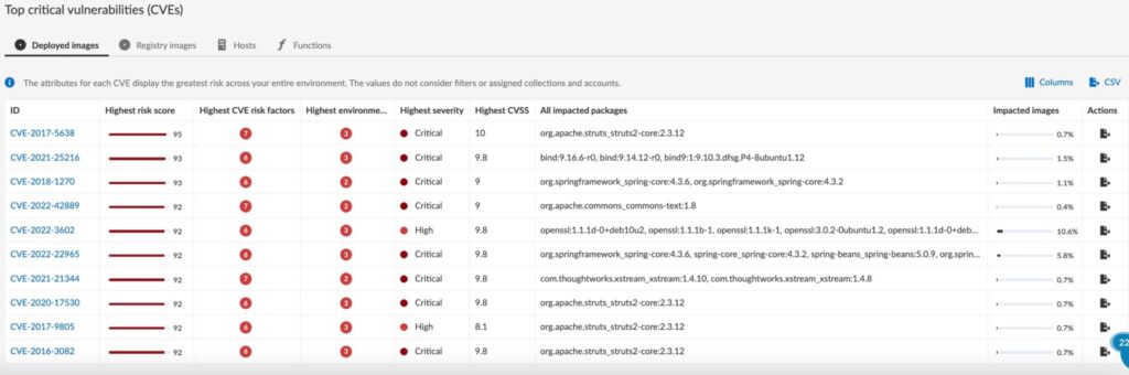 I större miljöer där fokuserade insatser kan vara en fördel kan CVE-poängen vara ett effektivt prioriteringsverktyg. Återigen används samma komponent för att extrahera paket som har distribueras i samband med en given tjänst, vilka i sin tur mappas mot CVE-databasen. Ett riskpoäng över 90, som nedan, bör utlösa omedelbara åtgärder.