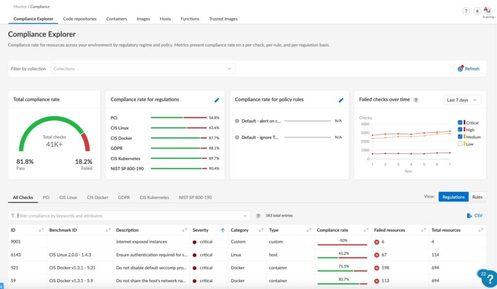 När Prisma Cloud-komponenten är integrerad går det omedelbart att se vilka delar en given tjänst består av. Nedan finns en skärmdump av portalen i compliance-visning.