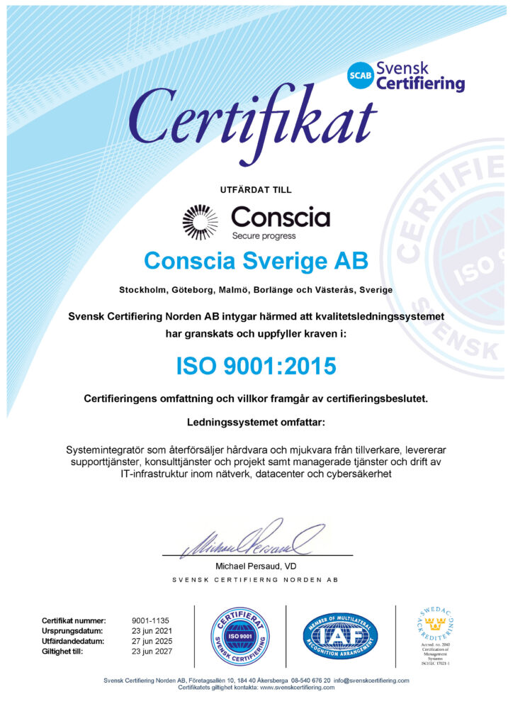 Det vi på Conscia vill skapa är en framtid där IT är och upplevs som enkelt och säkert. Conscias produkter och tjänster ska uppfylla kundens önskemål och förväntningar med rätt kvalitet, med rätt kompetens, i rätt tid där myndigheters regler och lagstiftning är minimikraven för vår verksamhet. Conscia vill vara en trygg partner för våra kunder och leverantörer. Vi vill erbjuda den bästa kundupplevelsen för våra kunder. Conscia ska samtidigt följa lagar och föreskrifter och kontinuerligt vara uppdaterade kring förändringar kring lagstiftning och andra bindande krav.